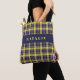 tartan check personalized winter tote bag. Fun festive Christmas holiday design. Yellow, purple, navy and gold. Colors can be customised.
