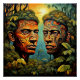 A.I. assisted print of lush, jungle foliage which has formed and emerged into two faces with vibrant, swirling, tattooed patterns representing the flora as living beings.