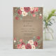 A warm taupe backdrop sets a moody and sophisticated tone for this design. Lush watercolor arrangements of burgundy roses, cream peonies, and soft peach blossoms create a rich focal point at the top and bottom edges. Tapered eucalyptus foliage and sage green leaves provide a natural, earthy contrast, perfect for a rustic autumnal event.