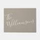 This doormat features a warm taupe background with the family name in large flowing white calligraphy script. Clean, minimal, and elegant — a personalized housewarming or wedding gift that works with any front door. You customize the family name.