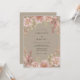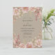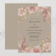 This design features a warm taupe background adorned with soft blush pink roses and delicate peonies. The botanical arrangement includes wispy eucalyptus leaves and muted greenery, creating a sophisticated aesthetic. Perfect for a romantic autumn or spring ceremony, the palette blends earthy neutrals with feminine floral accents.