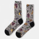 These spooky Halloween enchanted Hummingbird Garden socks feature a hand-drawn pattern in raspberry tones, green hues, yellows, and purples, all set against an elegant taupe background. Each element, from the hummingbirds to the bignonia flowers and leaves, mushrooms, and wildflowers, bursts with autumn life and color, creating a captivating scene that exudes joy and freshness.