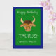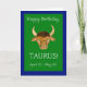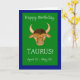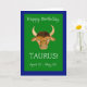 A birthday card for a Taurean with a bull's head from a watercolour painting by Judy Adamson. The greeting and dates are in white lettering on a green background, with a dark blue border and the inside is left blank for your own message.