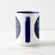 Mug featuring the zodiac symbol for Taurus in soft silver blue, as a round medallion, overlaid with the stars of the constellation, against a starry sky background graded from deep midnight blue to black.