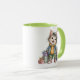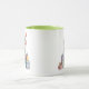 Taza de cerámica con interior y asa en color verde, decorada con un adorable gatito estilo ilustración infantil, vestido con ropa de invierno y rodeado de pequeños regalos.