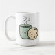 A steaming tea mug and a happy biscuit lean against each other for comfort. Their rosy cheeks and lazy lines radiate coziness and simple pleasure.