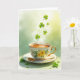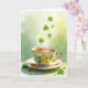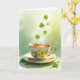 This card features a white porcelain teacup and scalloped saucer decorated with yellow flowers and green leaves, edged with a thin gold trim that catches the light. A gold handle and a small gold spoon rest neatly along the saucer, as if set out for two close friends sharing a quiet moment. Inside the cup, an amber tea glows warmly while soft steam rises in pale curls, adding a cozy, intimate touch. Above the cup, bright green shamrocks drift upward in different sizes, like a gentle toast floating into the air ☘️. The background fades from soft spring green into a sunny yellow glow at the upper right, giving the scene a fresh, early-morning feel 💚. St. Patrick’s Day text sits near the top in green lettering, balanced so it doesn’t crowd the cup. A few small shamrocks are scattered along the surface below the saucer, grounding the composition with tiny green accents.