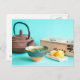 Tea set for one person with cast iron teapot, handmade clay teacup, tea box and two cheese scones.
