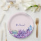 A lovely paper plate with a pinkbackground, purple flowers, blue tea cup and tea pot. Perfect to celebrate a twin-mom-to-be. Text is customizable. Your baby shower guests will love eating off this colorful plates!