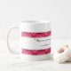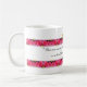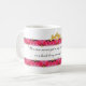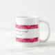 The design on this mug features a quotation of the author C. S. Lewis speaking of his love of tea and books. It reads "You can never get a cup of tea large enough or a book long enough to suit me." The quote is bordered top and bottom by a band of pink roses and golden hearts. In the center of the upper band of roses there are two bows of golden ribbon joined by two golden hearts. This mug was designed for tea and book lovers, but the text can be personalized for other loves. Matching teapot available.