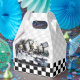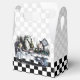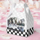 Gable-style favor box with a vintage Alice in Wonderland image, on the front and back, of the Mad Hatter’s tea party with Alice, the March Hare and Dormouse on a gray and white and black and white checkerboard background. See the entire Wonderland Favor Box collection in the PARTY FAVORS section.