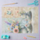 Romantic tea party table set with elegant bouquet in soft pastel colors butterfly, teapot and tea cups featuring pale pastel blue and pink floral artwork. Script handwriting ephemera is layered softly over the crackle textured image.