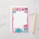 This tea party stationary is decorated with a teal green teapot sitting next to a stack of teal green and pink teacups on the bottom. At the top of the stationary there are two pretty little girls adorned in dresses sitting in a teacup and three butterflies in between them.
