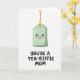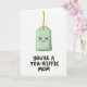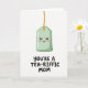 This card features a personified light green tag hanging against a white background, giving the scene a cozy, friendly look ❤️. A thin golden-yellow string loops through a small matching eyelet at the top, as if the tag has just been tied onto a gift for someone special. The tag’s face is simple and sweet, with gently closed eyes, small lashes, a soft pink blush on the cheeks, and a calm little smile that feels like a quiet “thank you.” Light shading around the edges adds a touch of depth, making the tag look softly rounded rather than flat. Beneath the illustration, the message “YOU’RE A TEA-RIFFIC MOM” sits centered in dark lettering, with the words stacked neatly so they’re easy to read. The playful pun pairs with the tag’s tender expression, like a warm inside joke shared between close family members 🌼. The palette stays minimal—pale green, blush pink, golden yellow, and dark text—while the golden string arcs upward from the tag and disappears near the top edge.
