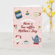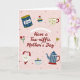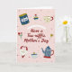 This design shows a soft pastel pink background filled with tea-time objects and loving accents that feel like a shared moment ❤️. In the center, the phrase “Tea-riffic Mother’s Day” sits in large dark-blue letters, with smaller accent words tucked neatly around it for balance. Nearby, a sturdy blue tea tin dotted with small gold stars sits close to a white teacup decorated with matching stars and a bright red handle, as if set out for someone special. A tall teapot with vertical stripes in blues and reds stands alongside a light blue cup patterned with tiny snowflakes, suggesting a cozy table arrangement made with care. Red flowers and a small potted tulip add a gentle, affectionate touch, like a quiet thank-you left by the kettle 🌼. Little gold dots and tiny red cross marks scatter across the background like confetti, keeping the scene lively without crowding it. A large heart shape and a smaller gold heart on a stick sit among the tea pieces, both outlined clearly against the pink backdrop.