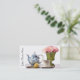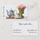 Tea Time still life fine art photograph by Terry McClary featuring a blue and white tea pot, a green glass vase filled with pink rose, a vintage tea cup, a spiral sliced lemon, and a vintage silver butter knife on a reflective marble table top with a bright white background.