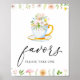 Favors sign featuring an illustration of wildflowers, greenery and teacup with the word "favors" in a fun calligraphy script.
