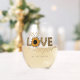 Teach Love Inspire Teacher Sunflower Modern Personalized Name stemless wine glass features with the text "Teach Love Inspire" in a fun modern leopard print script typography and accented with a heart and sunflower and personalized with your custom name. Perfect for teacher appreciation for Christmas, birthdays and the holidays. Designed by ©2025 Evco Holidays www.zazzle.com/store/evcoholidays