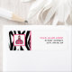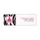 A return address label for teachers featuring an illustration of the Pink Schoolhouse logo at left over a zebra print background with pink trim. Personalize with your name and address at right.