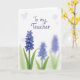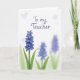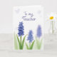 This design shows a calm spring scene with a tall cluster of tiny, bell-shaped flowers in periwinkle blue rising from slim green leaves, with a gentle, caring feel like a quiet thank-you between friends 🌷. Soft, diffused light falls across the petals and foliage, bringing out fine texture without harsh shadows. Behind the main bloom, similar flower shapes fade into a blurred mid-ground, adding depth and a tender, daydream-like mood. The background is a luminous, pearly white with faint lavender heart shapes drifting lightly, suggesting affection in a subtle way 🐇. Near the top, the words “To my Teacher” sit centered in flowing purple lettering, standing out clearly against the pale backdrop. The main flower remains the sharp focal point, while the softened distance keeps the attention on the foreground like a steady gaze. Colors stay gentle—blue, green, and soft purple—so the scene feels calm and close. Small, wispy lavender hearts appear scattered behind the bloom on the white background.