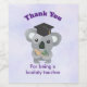 A wine bottle label for teacher appreciation or other situations. Text says "Thank You for being a koalaty teacher ". Customizable text. Designed with an illustration of a cute gray koala eating some eucalyptus leaves, wearing a black graduation cap. Set on a light purple digital watercolor background.