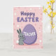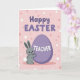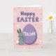 Designed with a soft pastel look, this card features a grey bunny hugging a large violet egg on a pale pink background 🐰. Across the upper third, rounded lavender letters spell out a cheerful Easter greeting, centered and slightly raised with gentle shading. The bunny stands below the text with wide eyes and rosy cheeks, leaning in as if cuddling the egg like a close friend. On the egg, the word “TEACHER” appears in crisp white letters, centered and easy to read. Small polka dots in light pink and white scatter across the backdrop, adding a light, festive touch 🌷. The bunny’s tiny paws wrap around the egg, and its ears tilt upward in a sweet, attentive pose. A fluffy white tail pops out on the bunny’s right side, bright against the grey fur and pink field. Share Easter sentiments with someone special this season.