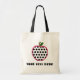 A bag for teachers featuring an illustration of an apple outlined in pink with black polka dots.