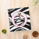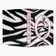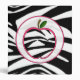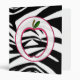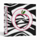 A binder with a zebra print design on the front, back, and spine. Sheer circle with pink trim on front center. Matching zebra print apple over circle. Pink trim on spine. Add your own text to spine.
