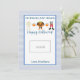 This teacher Halloween card features a blue and white plaid background with orange accents and says "No tricks, just treats. Happy Halloween!" and a cute watercolor trio of halloween costumes. There is also a space to leave a gift card. Personalize with your child's name.