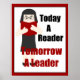 A graphic design of a gal reading a book by artist/designer Charmaine Paulson on a poster. The text reads "Today a reader, tomorrow a leader". ©2008charmainepaulson