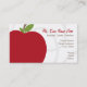 A simple, traditional business card for teachers featuring an oversized illustration of a red apple at left and a swirl background. Personalize the text at right.