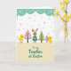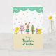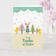 Designed with a gentle spring scene, the front shows a brown bunny in a teal dress holding a patterned egg close, with two round yellow chicks leaning in as if sharing a friendly moment 🐰. They stand on a creamy yellow strip at the bottom that looks lightly textured, like soft ground underfoot. Around them are stylized trees, including two with pastel, blossom-like leaves and one cone-shaped evergreen dotted with small round ornaments that add a festive touch 🌷. The upper background is mostly white, sprinkled with pastel circles that float like confetti bubbles above the group. Near the top, a mint-green scalloped border hangs like a soft banner, framing the scene without crowding it. The message “To my Teacher at Easter” sits in the open white area above the characters in a casual, handwritten look, standing out clearly in a darker ink. The bunny’s teal dress, the chicks’ sunny yellow feathers, and the mint border create a calm palette, with pastel dots scattered across the sky-like space.
