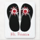 A mousepad for teachers featuring an illustration of a pair of black flip flops with red and white pom poms covered by a button with an illustration of a red apple. Personalize with your name in red at bottom.