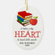 Personalized teacher christmas ornament featuring a pile of colorful school books, an apple, the cute saying 'it takes a big heart to teach little minds', the teachers name, and year.