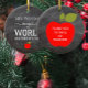 Typography script tree ornament for teachers with an inspirational quote: "Teachers change the world one child at a time", with a symbolic red apple and your custom text on the backside. +++++++++++ Personalize it with your teacher's name! ++++++++ It can be a pretty Christmas gift for a teacher.
