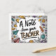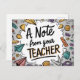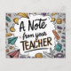 Brighten your students' day with this colorful and fun postcard! Perfect for elementary school, this 'A Note from Your Teacher' postcard is ideal for back to school greetings, or a positive note home. Teachers can use this educational and engaging design to welcome students in a memorable way. Featuring playful school supplies and an apple illustration, it’s perfect for all ages. Add a personal message on the back to make each student feel special. Great way for teachers to develop relationships or just to share student progress.