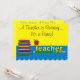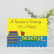 Unique Teacher Retirement Party Invitations. Yellow, blue background with fne black and white trim on bottom. Stach of multi-colored books, pencil, apple and "A Teacher is Retiring...It's a Party!".