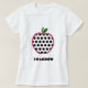 A teacher shirt featuring an illustration of a white apple with black polka dots. Apple is outlined in pink. Black text says "TEACHER."