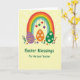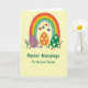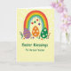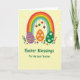 Designed with a springtime look, this digital illustration features a wide rainbow-like arch of many colors curving over three decorated egg shapes, like close friends gathered under one shared canopy. The first egg is deep purple with sunny yellow stripes, the second is bright orange with small white floral shapes, and the third is fresh green with matching white blossoms, arranged side by side in a cozy cluster. From the top of the arch, little dangling accents hang down—red hearts and small green and purple flowers—adding a gentle, affectionate touch 🐰. Around the bottom edge, scattered flower shapes in violet, blue, and coral fill the space like a garden where everything leans in toward the center. The background is pale yellow with soft white dots sprinkled throughout, like light confetti drifting behind the scene. Near the bottom, a short greeting for a teacher sits centered in rich green lettering, placed just below the flowers 🌷. The eggs show subtly textured bands, and the arch above them is layered in multiple thin color stripes.