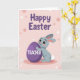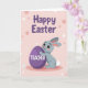 This card features a grey, rabbit-like character with big, expressive eyes and rosy cheeks, cuddling a large deep-purple egg with a tender, friendly squeeze 🐰. The character’s small smile and relaxed posture make it look like a sweet gift being offered to someone special. The background is pastel pink, scattered with soft pink and white dots in different sizes, like gentle confetti floating around the scene 🌷. Near the top, a seasonal greeting appears in purple lettering, centered above the illustration. Across the front of the purple egg, the word “TEACHER” is written in white, standing out clearly against the darker surface. Rounded shapes and simple shading keep the focus on the affectionate hug and the warm connection between giver and receiver. The purple egg sits close to the character’s chest, with the white “TEACHER” text stretching across its middle.