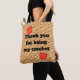 Thank a special teacher for all they do whether it is during the holidays or at the end of the school year. This tote bag offers a fitting way to express your appreciation gifting your teacher a great tote bag to carry items back and forth or use for grocery shopping. The light brown, textured background resembles a basket weave pattern. Two red apples accent "Thank you for being my teacher". All text can quickly and easily be customized to suit your needs.