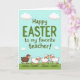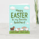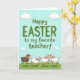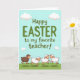 This design shows a spring scene with four stylized sheep trotting across a grassy green field, their lifted little legs suggesting they’re moving together like close friends. Three have white wool and one has warm brown wool, and each wears a small smile with bright, friendly eyes that seem to glance toward the others. Across the top, a large festive message sits in thick green lettering, with a smaller line below it that reads like a note meant for a valued teacher. The text is centered and stands out strongly against a pale blue sky, keeping the words easy to spot before your eye drops to the animals. A few soft white clouds float behind the lettering, adding a gentle springtime mood 🌷. Light shadows sit under the sheep, giving the field a bit of depth while keeping the illustration simple and graphic. The overall layout feels cozy and affectionate, like a group stroll where everyone stays close 🐰. In the background, the sky remains pastel blue with scattered rounded clouds above the bright green grass.