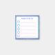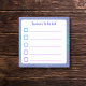 This teacher to do list sticky notepad can be personalized with the teacher's name. It is a small square 3x3 sticky notepad with shades of blue and purple text on a white background. There is a pseudo sparkly purple and blue border. You can change the text that says "To Do List" to some other type of list if you wish. There are check boxes next to each of 5 lines that can be ticked as each task is completed. Keep it simple with just 5 things to do!