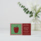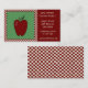 This business card is perfect for any teacher. It features a red apple on the left side on a green background surrounded by a white and red checked border. The teachers information is on the right side with a red background.