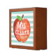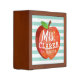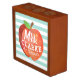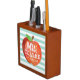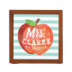 A fun and lighthearted seafoam green striped desk top pen holder featuring a stylized apple illustration. Inside of this apple is your favorite teacher's name in a playful style font.