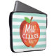 A fun and lighthearted seafoam green striped laptop case featuring a stylized apple illustration. Inside of this apple is your favorite teacher's name in a playful style font.