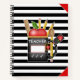 Teacher's Apple and a Mug on a notebook with jaunty BW stripes. The cover has an image of an apple in a cupcake, classic yellow pencils, rulers and a black chalkboard cupcake on old-school ruled pages. Choose your own custom title or add a name as optional choice. And decide on the look with 10 different interior pages, and the color of the spiral.