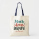 Teacher's Appreciation Personalized Tote Bag Reads "Teach Love Inspire" in a bold, fun font, accented with cute, hand drawn hearts and personalized with your favorite teacher's name.
