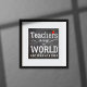 Typography script inspirational teachers quote with red apple on chalkboard background: "Teachers change the world one child at a time"