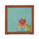Personalize name, A+, teacher, even grade! Stack of books with reading, writing and math labels. A red apple with a leafy stem and a yellow pencil holder with colored pencils. All on a light blue patterned background